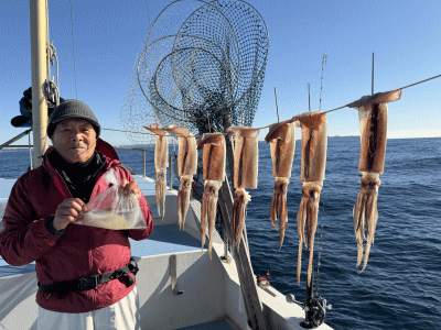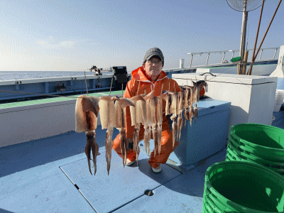 大型1号で出船し洲崎沖160〜230mを攻めました。スルメ優勢で最高4点掛けもあり盛り上がりました!トップ31匹と皆様お土産GET!好調でした!