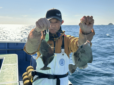 大型3号で出船しました。城ヶ島・剱崎沖20〜40m前後を攻めました。1日を通してポツポツと拾い釣りでした。良型カワハギも交りました!
