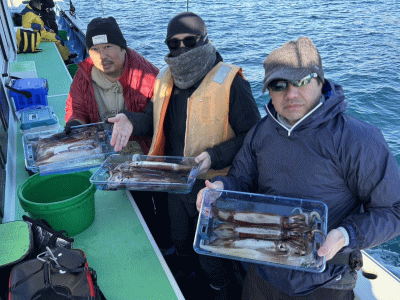 大型1号で出船し洲崎沖150〜200mを攻めました。スルメ優勢で最高4点掛けもあり盛り上がりました!トップ35匹と皆様お土産GET!好調でした!