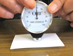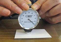 硬度計はOBST製 0〜100で表示 ゴムタイヤ等の測定用 テスト材の仕様 バルカナイズド ファイバー 寸法:0.8×91×55 ベース:ガラス面上 |