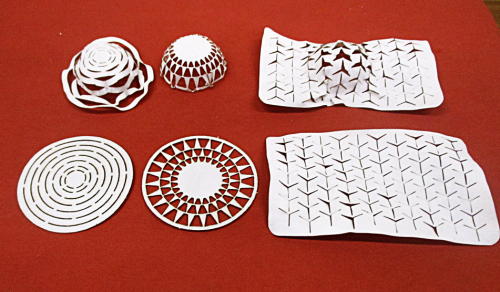 | 一枚の紙を切り込みを入れて半球形を作ってみました。 それぞれに一理は有る訳ですが濡らして曲げて球に押し付けて作ってます。 見た目は伸びて作っているようには見えますが実は縮めて作っているんですね。 持ち堪えるだけの強さが必要なんです、バルカナイズドファイバーにその耐力が有るとなります。 写真の下の段は切り込み図形、上の段は変形図形となります。 水分を含ませ柔らかくして変形、乾燥させて硬くして定着という工程になります。 |