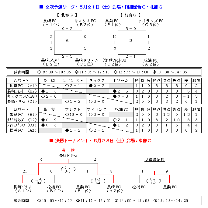第11回 長崎県クラブユース選手権大会 * 本大会の上位2チームは7月2・3・9日に熊本県で行われます「第20回 九州クラブ ユースサッカー選手権(U-15)大会」に長崎県代表として出場する権利と義務を負う。