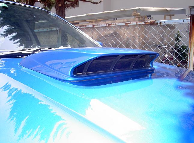 | ボンネットに一際目立つインタークーラー大型エアインテーク。エンジン上部にマウントされたインタークーラーに効率良く新鮮な空気を取り込む為に設置されていますが、スポーツシーンで活躍する(勝つ)事を前提に開発されたIMPREZAのエアインテークはLEGACYのものよりも遙かに大きいです。 |