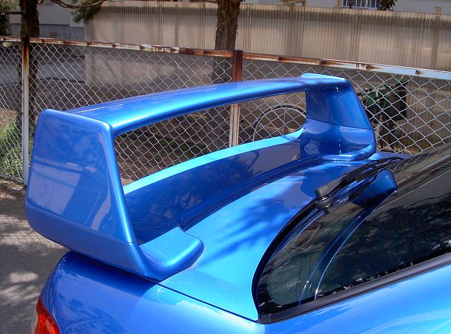 | WR-CARと共通のイメージを持つ大型のリアスポイラーです。IMPREZAの特徴の1つです。角度調整機能はオミットされていますが、大きなダウンホースを稼ぐ武器には変わりありません。とにかく派手で目立ちますが私は大好きです(笑)。 |