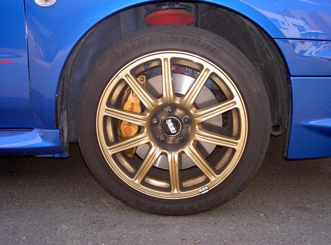 | ディーラーオプションで装着できるBBS製のアルミホイール。やっぱりブルーのIMPREZAにゴールドのホイールは似合います。私のLEGACYにも着けたいなぁ(笑)。スポークの隙間から顔を覗かせているのはbrembo製のブレーキキャリパー。こちらも私のLEGACYにも着けたいなぁ(笑)。ホイールに付着している黒いススの様なモノはブレーキダストです。 |