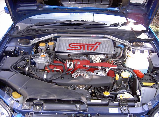 | エンジンルームです。STiのロゴが描かれたインタークーラーが特徴的。標準でストラットタワーバーが装着されているのも、この車の特徴です。エンジンはBP5A型LEGACYと同様、EJ20ツインストロークターボが装備されていますが、こちらの方が性能は上。このエンジンから絞り出される最高出力は自主規制枠ギリギリの280psで同じですが、最大トルクは40.2kg・mにまでアップ。軽量も手伝って、加速はLEGACYの比ではありません。 |
