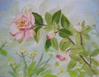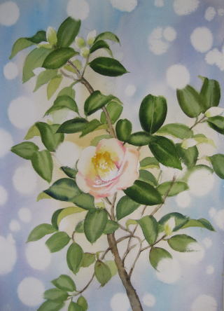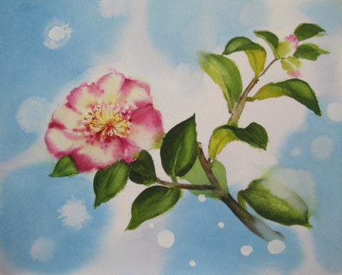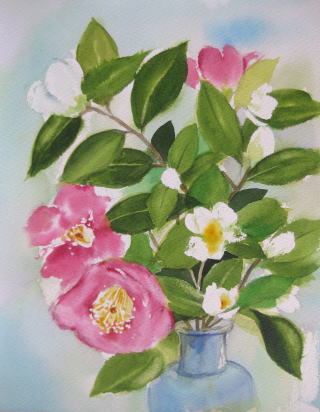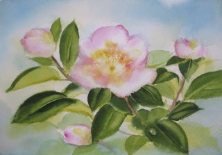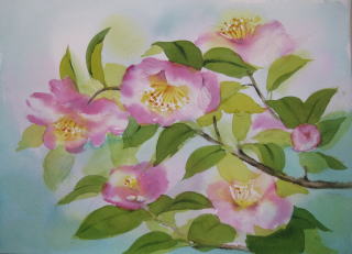 私が担当している水彩画教室では今、椿を描いています。前回は山茶花がお手本でした。教室当日