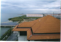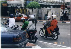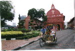 ホテルから見たマラッカ海峡イスラムの女性 海岸にはバイクの二人乗りでアベックが来ていた。後部座席には 頭を頭巾で覆った少女が乗っていた。目だけはぱっちりしてハッキリとした目で あったが、全体的には??であった。これはこれから出会ったイスラム教の女性 に共通していた。 中東のイスラム教徒みたいに目だけ出して歩いていたら男はどぎまぎするだろう な。 マラッカ市内 サンチャゴ砦、セントポール教会に行く。団体の日本人観光客が居 た。マラッカはポルトガル、オランダ、イギリスの順に支配されていたのを実感。 セントポール教会の丘からはマラッカ海峡がよく見渡せた。沖にはやはりタンカー らしき大 型船が数隻視界に入った。ここが中東と日本を結ぶタンカーの生命線、 いわば日本の生命線かと感慨深かった。 坂を下りてオランダ広場に行くと、バイクが数台止まっていた。HONDA、KAWASAKI、 YAMAHA、皆日本製であった。こちらではYAMAHAが人気だそうである。排気量は50cc から100cc位であろう。くたびれたバイクには出くわさなかった。 教会の前で輪タクを借りて記念写真 コースにあった仏教寺院はなんだかの理由で車の中からの見学。 マレー人の住居 マレー鉄道に乗るために内陸に向かう。途中、高床式のマレー 人の住居を見学。 マレー人は明日がお正月と言うことで家の中ではその料理を作っていた。 イスラム教では4人まで奥さんを持つことが出来る、というガイドの説明で数人 の奥さんはどこで居住するのか興味深く見る。 ガイドに「奥さん何人居ますか」と聞いたら、まだ独身と答え「運転手さんは2 人居ます」だって。たいして風采の上がらないような運転手に奥さんが2人も! なんだか腹立たしい。コノヤロー おれも回教徒になるか。 台所には食器が必要な分だけ片づけられている。日本では必要もない食器が狭い住居の 一等地を占領しているのがあほらしく思える。こんなことはカミさんには言えな いな。 窓にはガラスが無く風が家の中を吹き抜けるようになっているので以外と暑さを 感じない。しかし屋根はトタン葺きであった。これはかなり暑いであろう。これ から見るマレー人の家の屋根はたいていトタン葺きであった。それも錆が目立つ。 マレーシアには4季がないのでそんなこと気にならないのであろうか。 ゴム農園 途中の店で列車で飲むためのビールを購入し、次にワゴン車が止ま ったのはゴム農園の前。これは実に珍しい。小学校の時に確かスライドか何かで 見たとおりの光景であった。白い樹液が小さな容器に溜まっている。それを集め ている人が遠くに見える。土産に下に落ちている剥いだばかりの樹皮と種を拾う。