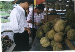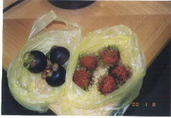 クワラルンプールの若者達、因縁付けられそうで怖々と撮る釣りは返した 今日はマレー人の正月でデパートはやっていないと言う話であっ たが、1軒のデパートはやっていた。中に入ってみるとなかなかの賑わいであっ た。床も綺麗に磨かれ、人々の衣装も清潔である。吹き抜けの真ん中でトークシ ョーをやっていて人々が集まっていた。5階のパソコン売り場に行く。日本と同 じぐらいの品揃えであった。店員が寄ってきたので見ているだけだと言ったら歓 待しているふうで気持ちが良かった。 デパートではベルトを購入。お釣りが10ドル多かったので返したら、ものすご く喜んでいた。日本人は正直だと名をあげたかな。 果物購入 デパートを出て昨夜行った夜店の辺りに行く。町には目の鋭いのや、と ろんとした目の人間もいる。デパートのパソコン売り場人間とはちょっと違う。 屋台の果物屋でマンゴスチンとランプータンという果物を数個ずつ買う。 これら散策中の状況は特定小電力無線機でホテルの18階にいる母娘には逐一報 告していたら、もう実況中継はいいわよ、なんて言われてしまった。 でも買って帰った果物は母娘に喜ばれた。