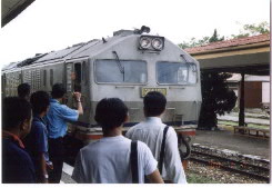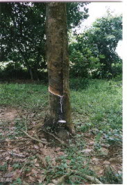 ゴムの木タンピン到着 タンピンという駅に着く。駅は市街地にあるかと思っていたら、 田舎の真ん中にあるような場所であった。それでも駅前には商店があるにはあっ た。鉄道の線路は狭軌、旧日本軍の影響を見る。 樹木にトゲ 列車が来るまで40分ほどあるので辺りを散策。道ばたにある 樹木の弾力性を 確かめようと手を付けたら、イテー!! 痛い痛い、手の平の4 カ所から血がにじんできた。その樹木をよく見ると樹皮には強力な棘があった。 持ってきた消毒液で治療したが、ここは日本ではないと実感、熱帯地方だー。