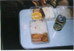 マレー鉄道弁当 時間通りには来ないと言われていた列車が時間通りに到着し乗車。弁当が 配られた。 弁当はプラスチックケースが二つ。一つにはチャーハンと鶏の唐揚げとウインナー。 もう一つにはハムサンドとゆで卵二つに切られたオレンジ。マレーシアを感じつ つすべて平らげる。ほかの日本人旅行者であろうか、ゴミ袋に弁当がそのまま捨 てられているものを見た。いつまで日本が持ちますか。自分が立派だから贅沢が 出来るわけではない。
