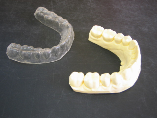 就寝時の歯ぎしりが予想される時に使用します。夜中、家族に『歯ぎしりがうるさくて眠れない』などと言われている方。ご自分で『自分の歯ぎしりの音で目が覚める』『最近歯がすり減ってきた』などと感じている方はご相談下さい。歯型を取らせていただいて、患者様一人一人に合ったマウスピースを作製します。ひどい歯ぎしりの場合には破損することもあり、その場合には再製作となります。健康保険適用。