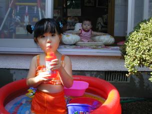 2003年夏、8月12日現在、秋田は真夏日がまだ数日・・・ そんな数少ない真夏日にpika_tekaは竿燈まつりのため家にいませんでした。 そこで家庭用プールを出して、水遊び・・・ 近いうちに海に行こうね!! |