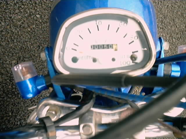 | まずはフレームですがこのDAX君、アメリカンです。 もちろんメッキ仕様 このままか塗装か悩みました。 悩む事30秒(早) 塗装に決定〜〜〜っ 剥離剤をたっぷりと塗り、数分後水洗い、繰り返す事3回 メッキの上塗りのクリアーが綺麗に落ちました。 兜フェンダー、フォーク、スイングアームも錆びを落として塗装待ちの状態です。 まずは塗装前に余計な油分取りのプレソルを吹き、乾いたら サフェサーを薄く2回、シルバーラメを3回 キャンディブルーを3回 注意:キャンディカラーは折り返し部分がどうしても 濃くなります、濃くならないように折り返しはしません 一方通行の要領で塗装します。 キャンディカラーが乾いたら2000番の耐水ペーパー を軽くかけました。 塗装の乗りが良くなるようにです。 ブルー、パープルのラメを吹きつけ 仕上げにクリアーを3回塗りました。 フレーム、ライトケース、フォーク、フェンダー前後、ウインカー ハブ前後、スイングアーム、チェーンカバー、ヘルメットがブルーです。 ホイールがシルバーのみ ラメを強調させる為にクリアーが乾いたら1500番、2000番の 耐水ペーパーで段差が消えるまで擦ります。 段差が無くなったらコンパウンドで艶が出るまで ひたすら擦ります。仕上げにカーワックスをかけます。 ついでにホワイトメーターを作りました。 メーターの枠を外し中身をばらします。 針、距離計にマスキングをしてパネルを白く塗りました。 目盛はレタリングシールを貼り100kmまで作りました。 見にくいかもしれませんが オレンジ色のランプの下に100kmがあります ↓ |
