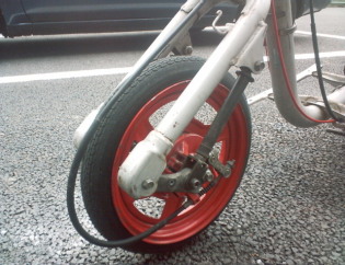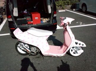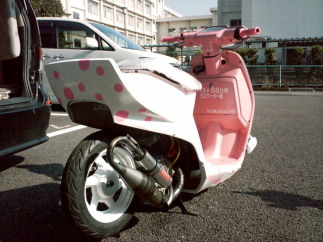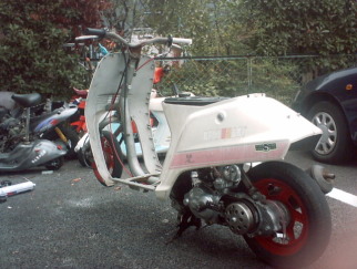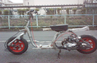 最初はパッソーラでSSマシーンを製作予定でしたが こだわりでクレタクに変更致しました エンジンはそのままスーパーディオです ベース車輌です スーパータクトでも良かったのですが こだわりたかったのでクレージュを探しました フロント潰れ、エンジン無しの状態で5000円で買ってきました 後ろ姿です フレームはしっかりしています ![]() エンジンはスーパーDIO ZX 改造箇所は吸排ポート研磨、ヘッド面研、デイトナプーリー、強化ベルト クラッチ軽量加工、アウター鏡面加工 センスプ10% KOSOインマニ、BIGリード加工、PE28 ハンガー製作です 画像はディオ用とクレタク用です これをニコイチにします シャフトの芯から芯まで22cmです このくらいのホイールベースが・・・ 長すぎかな? こんな感じ・・・ フロントはチャリンコのタイヤです ホイールはまだ塗ってません(#゚Д゚) 軽く外装を着けてみました 後ろ姿・・・ 途中の画像がありませんm(__)m いきなり完成です 2005年仕様 限界ローダウン ハッタリカッティングシール ポートを広げすぎて飛び出しました 飛び出したリングが・・・ コンロッド軽量、鏡面加工 ノーマルをばらした状態 ケース加工 デブコン盛り 一次圧縮UPトルクモリモリ仕様 クランク KN企画 (現在mizzクランク製作中) ポート 遠慮無しに広げました 非公認ですが3秒916出ました 角刈り特攻隊 ↑ クリック 2005年5月8日 京葉スピードランドにて ななパパさん 画像頂きましたm(__)m |