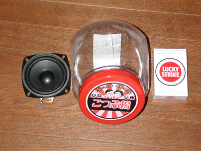 自作SPを作ってみようって事になりました。 SPはパソコン用のもので使ってなかったVictorの物を解体した 8cmのユニットです。 ケースは、駄菓子が入っていた物(笑) この角度に注目してみました。 |