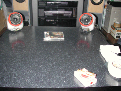 視聴した結果中に綿を入れた方が打楽器が気持ちよくなる事が わかりました。 テーブルのこの位置において、写真を撮ってる位置で聴くと最高です。 もちろんBHには勝てませんが、打楽器ではこちらに軍配があがります。 |