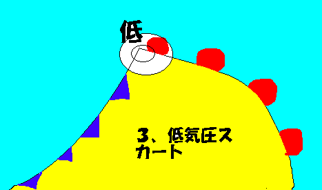 3、スカートに入る 低気圧の前線の間に入ることをこう呼んでました。 低気圧に伴う、2本の前線の形がスカートに見えるからでしょう。