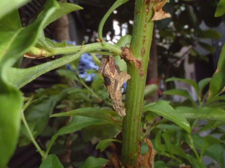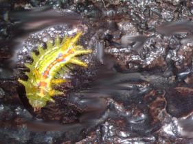この形の芋虫には、直接触れてはならない。刺されると結構痛いです……