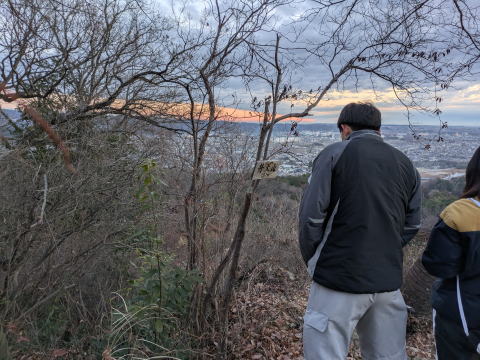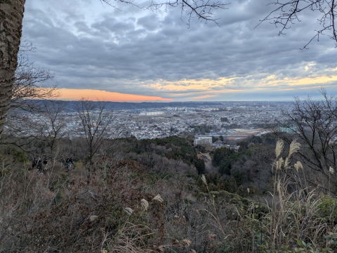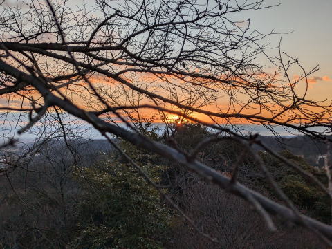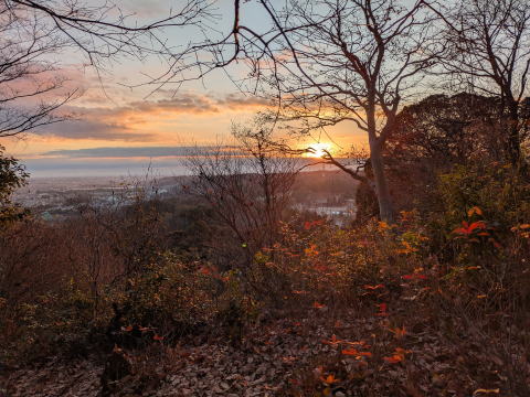 ペースを上げて、なんとか日の出まで間に合いました。山頂には既に、数名の方が、日の出を拝みに来ていました。あの辺りから日の出なら、木が邪魔することないと思ったものの、その後日の出が始まった場所は、予想していたよりも、南側で、初日の出は、弁天山山頂よりも、少し下の展望台周辺のほうが木が邪魔しないので、良いと思います。