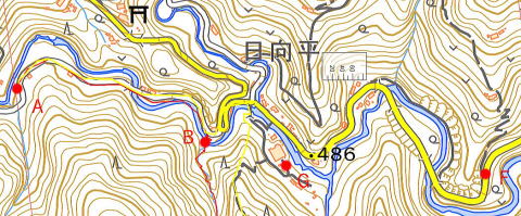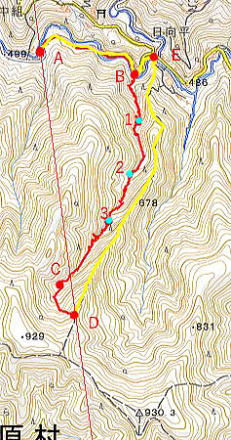 今回の山行のトラックログ(赤:登り、黄:下り) A:寒澤寺駐車場、B:480mシンナソー出合、C:770m二俣、 D:登山道に合流、E:藤倉 1:3段10m、2:3条3m、3:3段15m A→B→1→2→3→C→D→E→B→A |