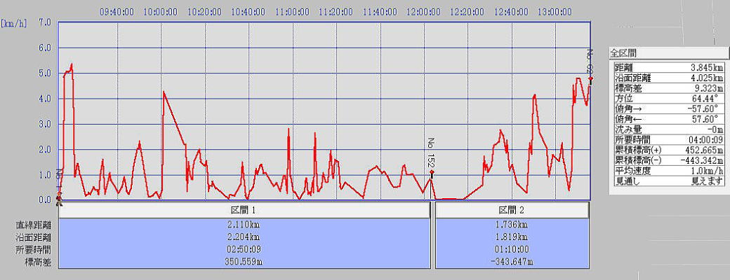 今回の山行の「速度/時刻グラフ」 (縦軸:速度、横軸:時刻)(区間1登り、区間2:下り) |