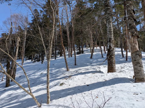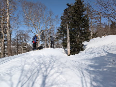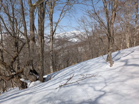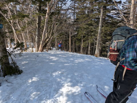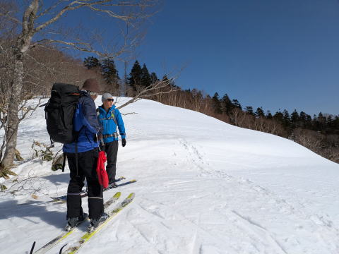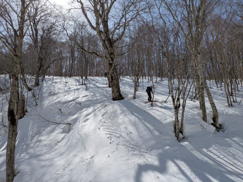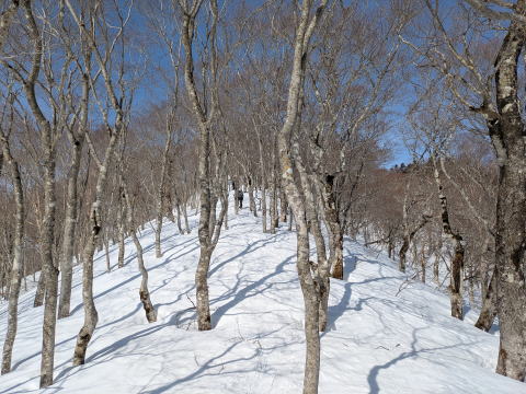 沢を渡った1500mから尾根にとりつくところのみが傾斜が強く、その後はなだらかではないにしろ、クライミングサポートを使うほどではない、山スキーにとってちょうどの傾斜が続く。登りは、信じられないくらいF川さんが早く、I井さんは、ビンディング対応で遅れた。G藤さんは、F川さんについていくよりは、I井さん、F浦さんのサポート対応をしていた。