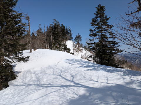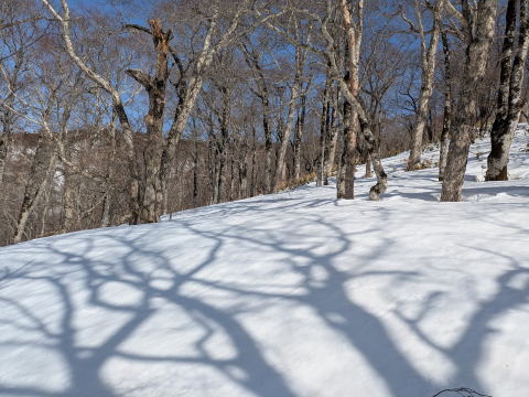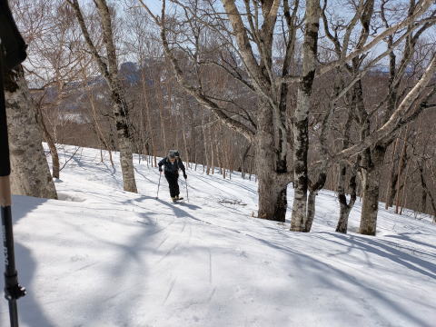 1870mより右の俣沢へ滑降は、ツリーランで、上手な人なら、連続ターンで対処できるが、自分は、テレマークターンをほとんどできず、横滑り、パラレルで対応。最近、テレマークスキーというのは、スキー(テレマーク)と考えた方が良いとも思う、テレマークターンはテレマークスキーを使った技術の一つ。できた方が楽しいし、安全度が増すが、必ずしもではない。
