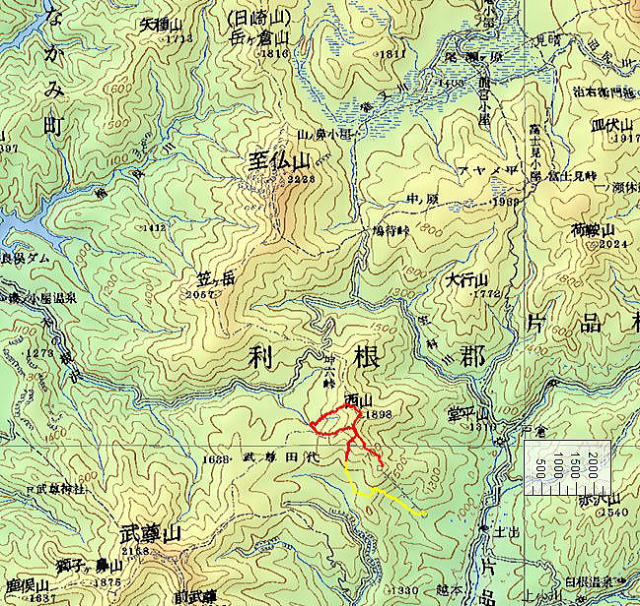 西山山頂へも、トラバース気味に登る。ここも西山を通り過ぎるのが怖かったが、右の俣沢にぶつかるので、地形を見れば、通り過ぎることはないのでした。