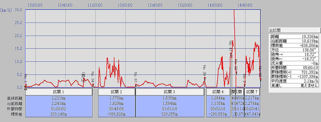 | 今回の山行の「速度/時刻グラフ」 (縦軸:速度、横軸:時刻)(区間1・3:登り、区間2・4:滑り(ゲレンデ外)、区間5・6:滑り(ゲレンデ)) |