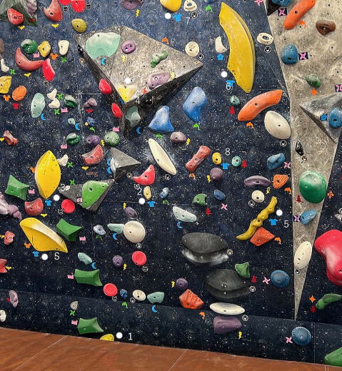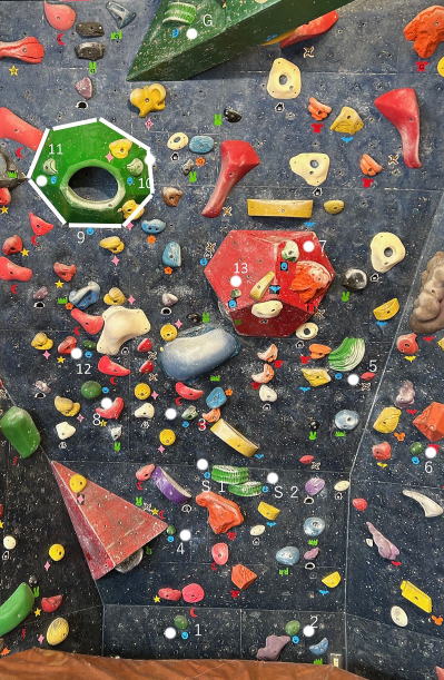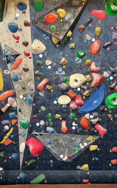 | 42 | カメロパルダリス | 10/26(午前) | 垂壁の4級ネズミ課題(右写真)、他の人が登っているのを見て、自分もやってみようという気になり、ゴール一手前までは行くものの、ゴールに触れることはできたものの、ゴールできず、別の方が登れたのを見ましたが、右写真で7のホールドを両手で持ち、5のホールドに足を置いた状態で、ゴールのホールドを取っていた。自分もそうしようとしたけど、その頃には腕の力がなくなっていて、ゴールできなかった。 次回、腕の力がある時に再度、挑戦したいです。 |