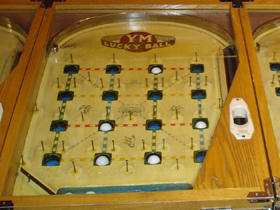 スマートボール 最近では、見かけなくなった昔風の ピンボールゲーム。 ボールを穴に入れて揃えていけば 得点が入る。 案外簡単そうに見えて実は そうではない! 16個の穴に入れるのは 相当の技術と熟練の技と運が必要だ。 君は16個の穴に入れる事が 出来るかは君の腕しだい!! 最高点を目指してがんばろう!